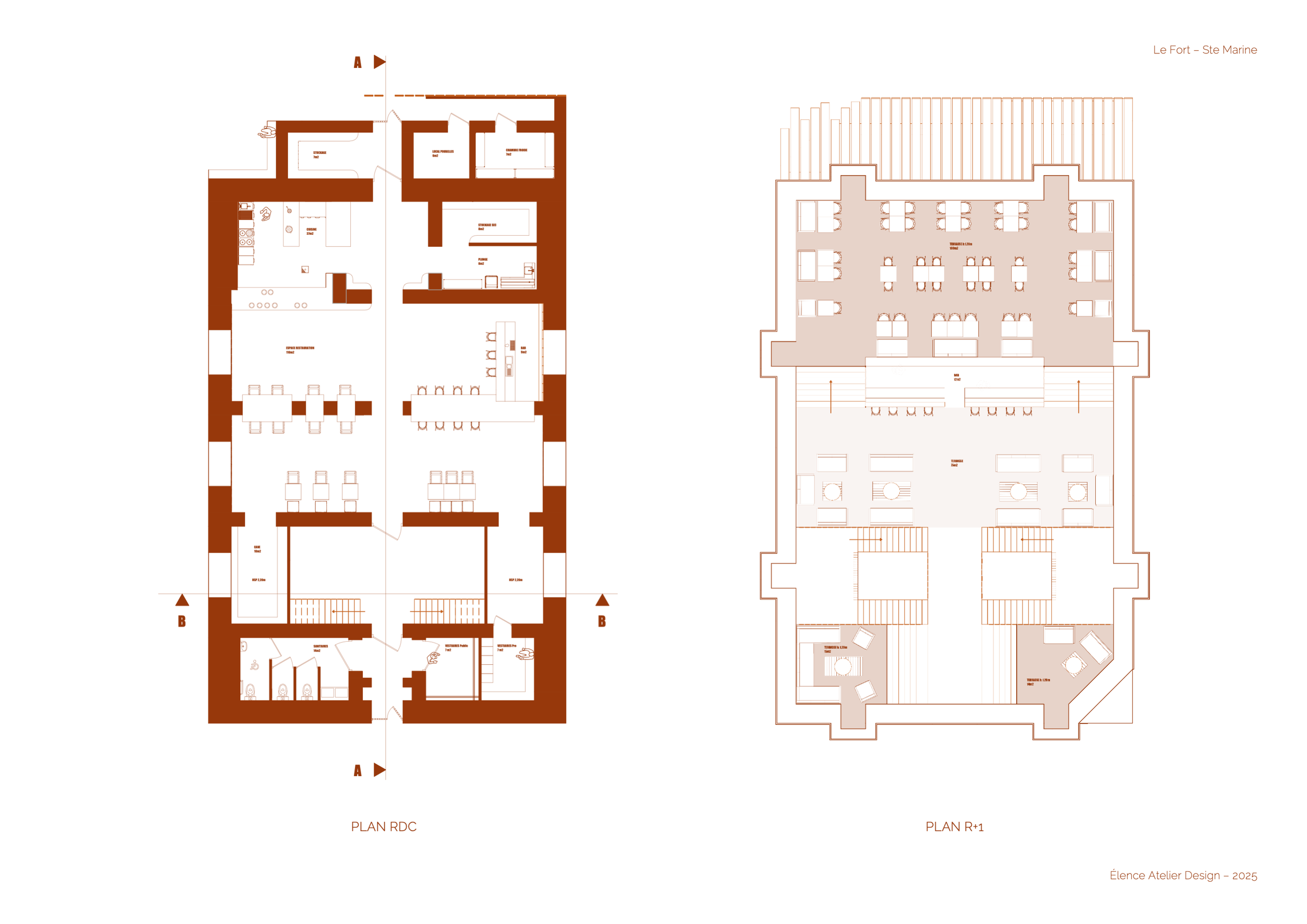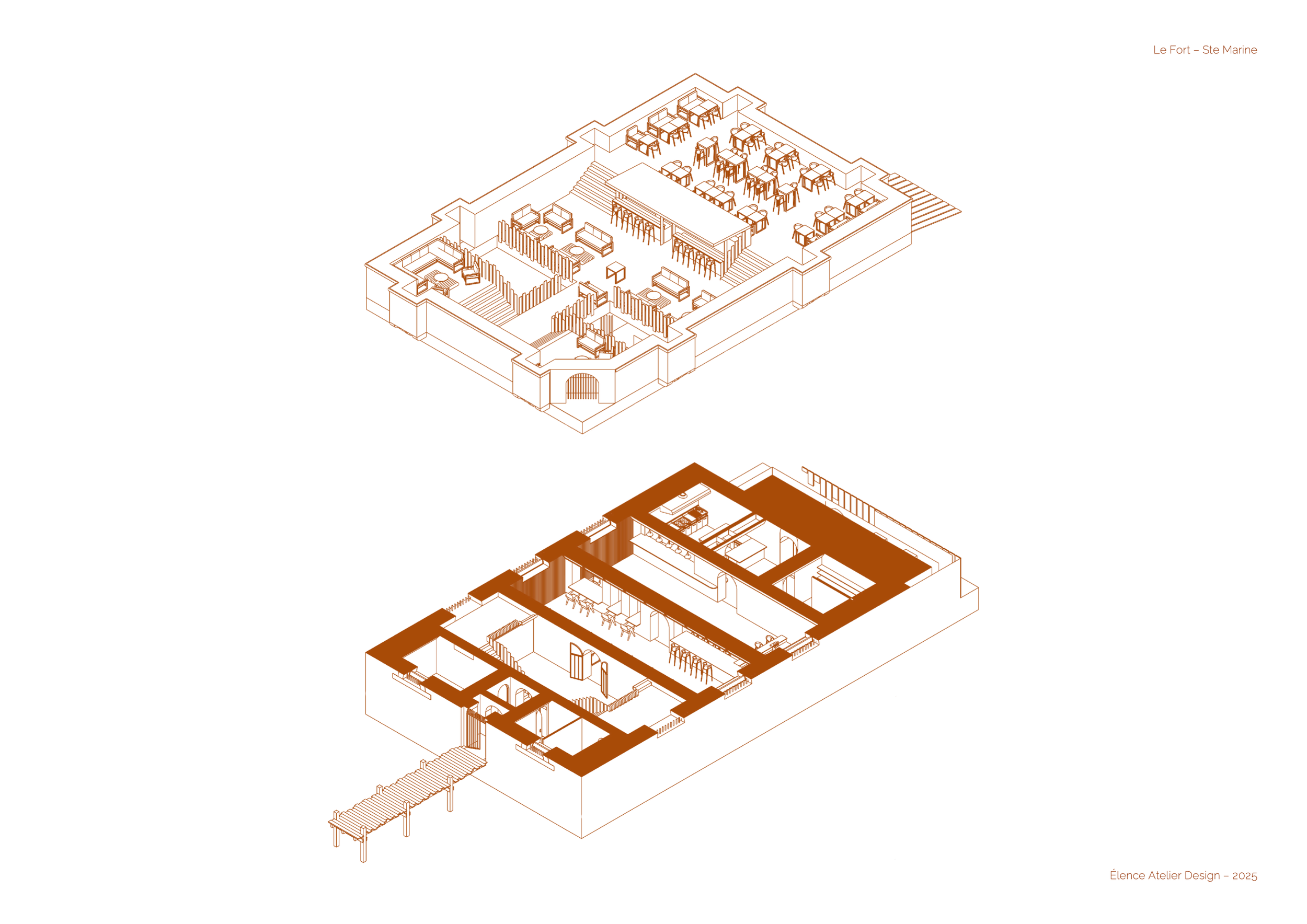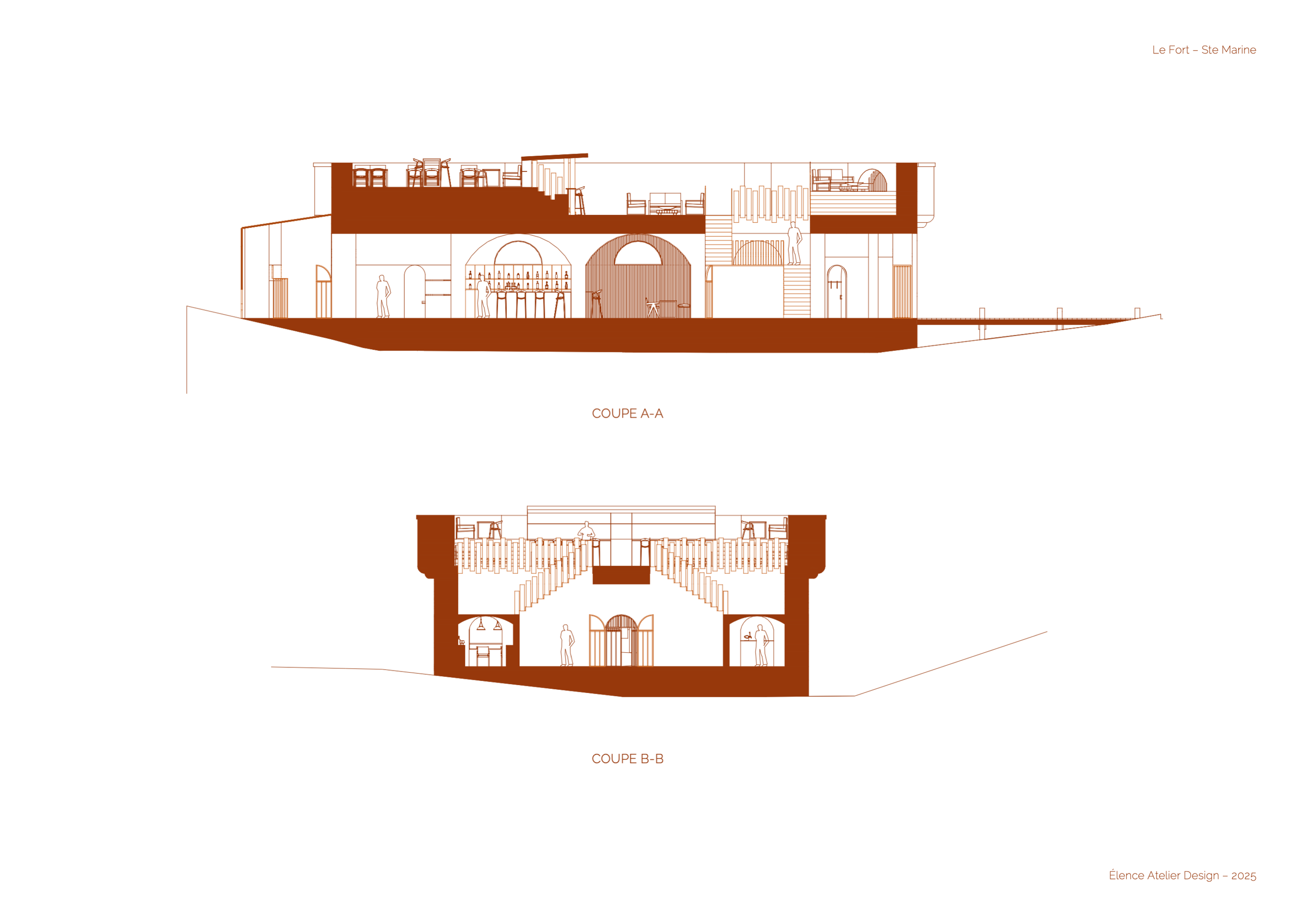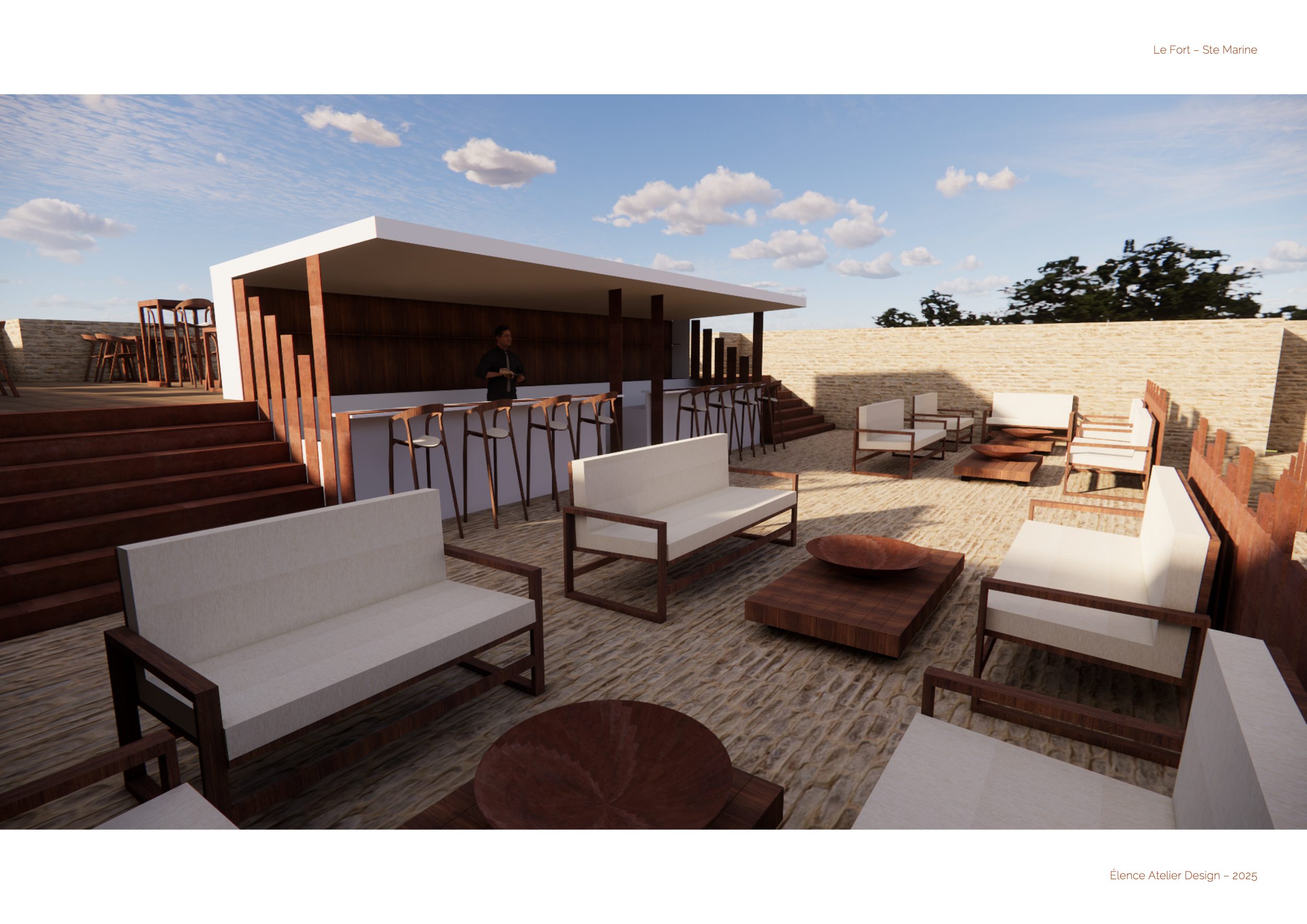 Le projet réhabilite le Fort de Combrit Sainte-Marine, construit en 1862, en un restaurant gastronomique avec dégustation de vins et rooftop ouvert sur la mer.